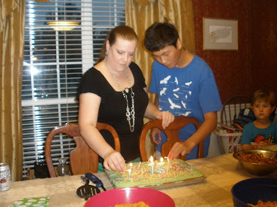 So with the impending nastiness and my mom's long drive back home, we decided we would at least let Colin open her gift before she swam an hour home.
